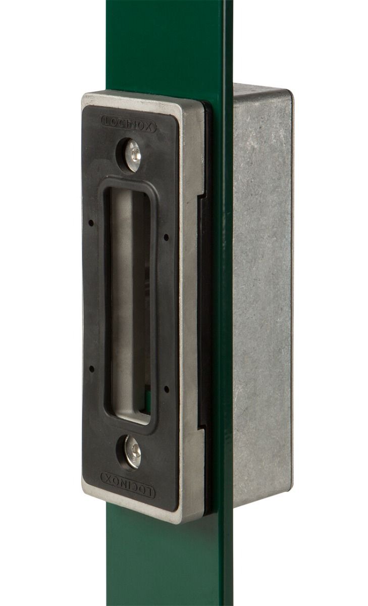 Roestvrijstalen schuifpoortaanslag voor vierkante palen. De aanslag is 9 mm auto-corrigerend rechts/links om een vlotte verankering van het schuifpoortslot te garanderen. Het geïntegreerde stootrubber verhindert krassen op de schuifpoort in gesloten toestand.