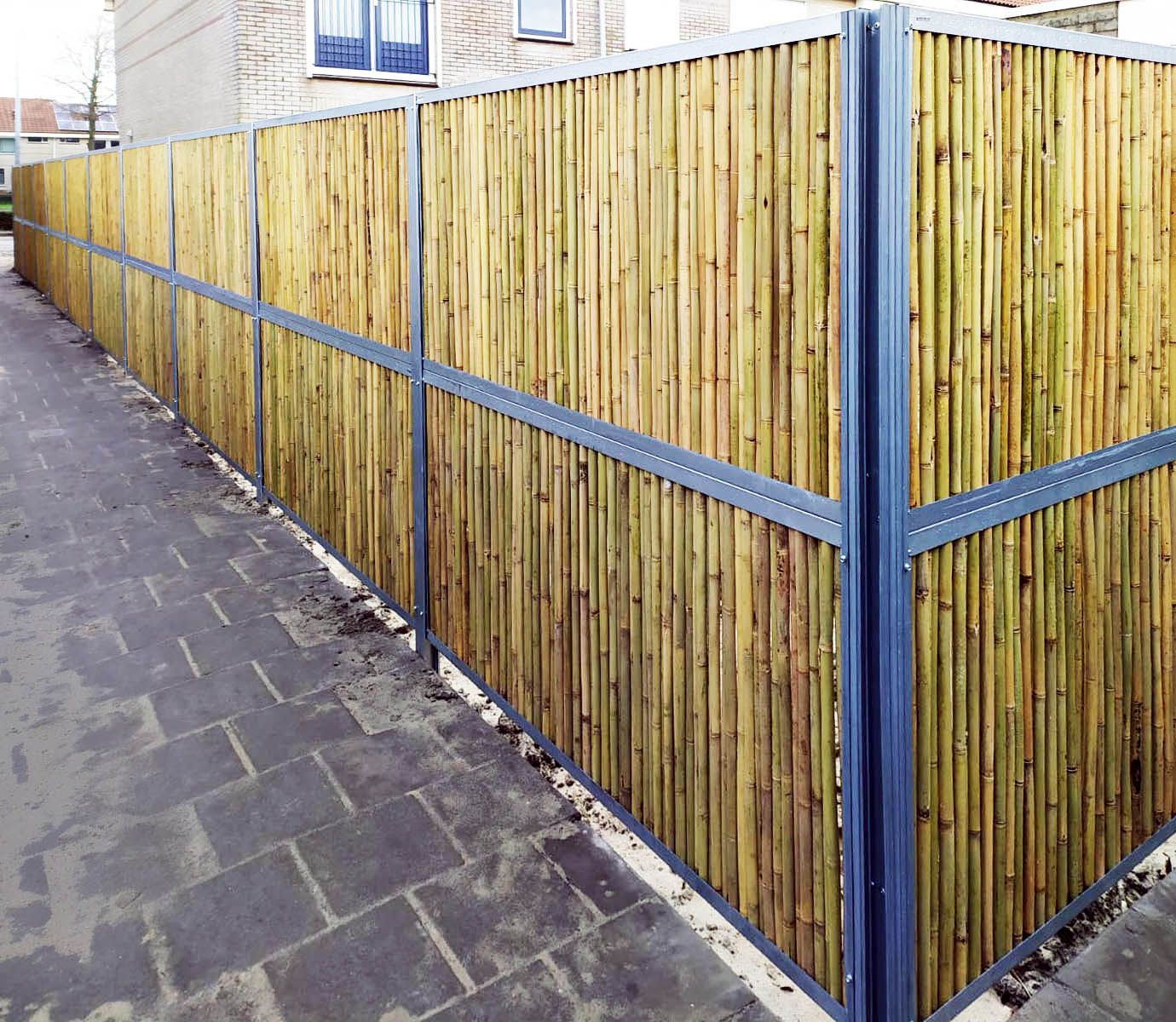 Bamboe is een zeer snel groeiende plantensoort, die overigens niet in Nederland groeit. Het groeigebied strekt zich uit over een groot deel van de wereld: tropische en subtropische gebieden. Zo komt het voor in grote delen van Zuid-Amerika, Afrika en Azië. Bamboestokken worden zonder wortel geoogst en de stok groeit heel snel weer aan. Deze stokken kunnen na een jaar of 4 à 5 weer geoogst worden. Dit maakt bamboe een hernieuwbare en duurzame grondstof. Bamboe heeft dezelfde eigenschappen als tropisch hardhout; het is heel sterk materiaal en verteert niet. De bamboe schutting heeft daarom een gegarandeerd lange levensduur. Tezamen met het stalen frame krijg je dus een schutting met lange levensduur.